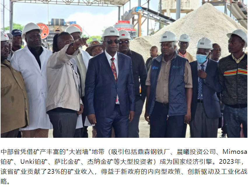 矿业是津巴布韦国民经济的支柱产业,对国内生产总值(GDP)的贡献率稳定在6.5%左右。作为国家外汇收入的重要来源,矿产品出口占津巴布韦出口总额的50%。津巴布韦拥有得天独厚的矿产资源禀赋,已探明矿产种类超过40种,是全球矿产资源勘探与开发的重点区域之一。其中,纵贯津巴布韦中部的大岩墙(Great Dyke)地区尤为突出,该矿带绵延550公里,宽4公里,已成为推动国家经济发展的核心引擎。得益于新政府实施的内向型经济政策、创新驱动发展战略和工业化战略,该地区吸引了包括鼎森钢铁厂、晨曦投资公司、Mimosa铂矿、Unki铂矿、萨比金矿、杰纳金矿等众多大型投资者。2023年,大岩墙地区矿业收入占全国矿业总收入的23%,充分彰显了其作为国家经济支柱的重要地位。